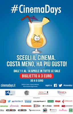 Dopo il successo ottenuto nell'edizione dello scorso anno che ha registrato 1.800.000 biglietti venduti in soli 4 giorni, tornano i CinemaDays da lunedì 11 a giovedì 14 aprile.